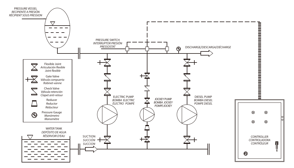 يتكون نظام مضخات إطفاء الحرائق الديزل Purity PDJ من مضخة طرد مركزي تعمل بمحرك ديزل، ومضخة جوكي عالية الضغط، ووحدة تحكم بالمضخة، ونظام أنابيب متكامل. كل وحدة تحكم مزودة بخط استشعار ضغط مستقل، مما يضمن تشغيلًا مستقرًا لمضخة إطفاء الحرائق بالرش وإدارة دقيقة للضغط أثناء حالات الطوارئ.